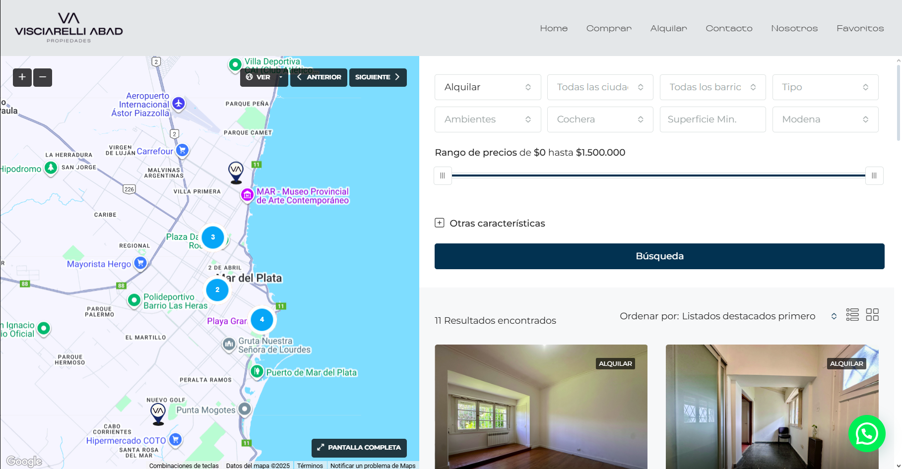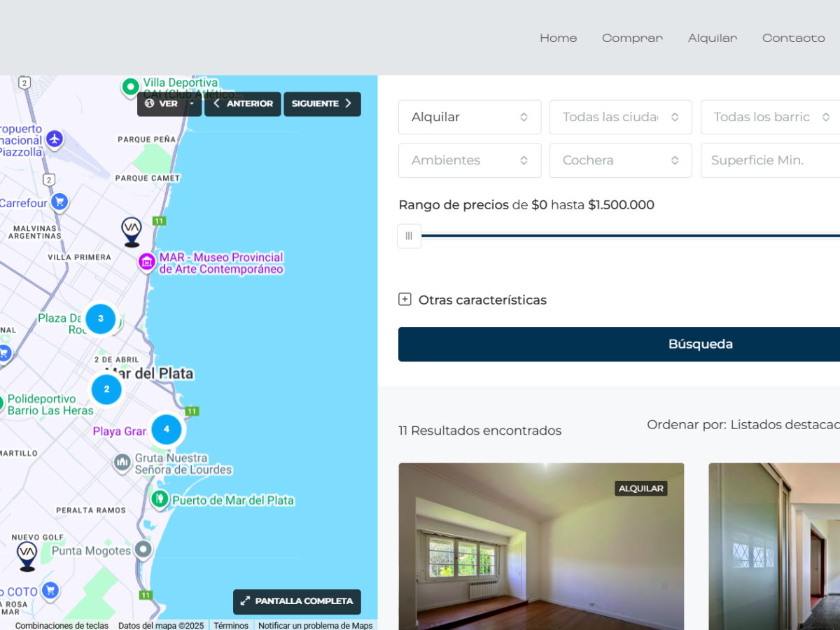 Carga dinámica de propiedades con geolocalización y filtros personalizados.
